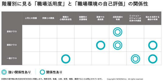 - 部長クラス課長クラス以上に「成長実感の有無」との強い関係性が見られ、自らや組織の成長を感じられているかどうかで、学びの活用期待度が異なることが示唆されました。