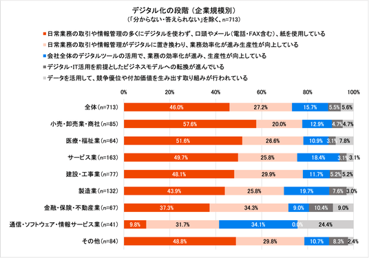 勤務先におけるデジタル化の取り組み状況について尋ねたところ、デジタル化が最も進んでいない「日常業務の取引や情報管理の多くにデジタルを使わず、口頭やメール(電話・FAX含む)、紙を使用している」の割合は、全体では46.0%。全体と比較して割合が高い業種は「小売・卸売・商社」57.6%、「医療・福祉業」51.6%、「サービス業」49.7%、「建設・工事業」48.1%です。