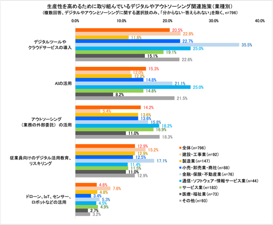 - 「サービス業」は、「アウトソーシングの活用」16.9%の導入率が比較的高いです。「デジタルツールやクラウドサービスの導入」19.1%、「AIの活用」14.8%は全体と同水準ですが、これらのさらなる導入率引き上げにより、生産性向上の余地があると考えられます。