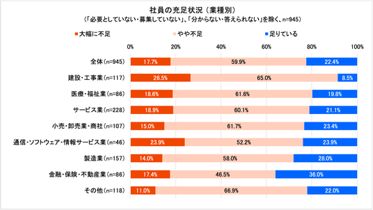 人材不足の割合が高い業種は「建設・工事業」「医療・福祉業」「サービス業」