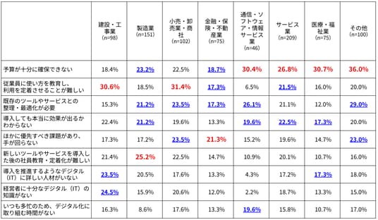 全体では、選択肢の中で「予算が十分に確保できない」を最も多く挙げた業種が4業種と多いものの、2番目・3番目に多く挙げた課題は、業種によってばらつきがあります。