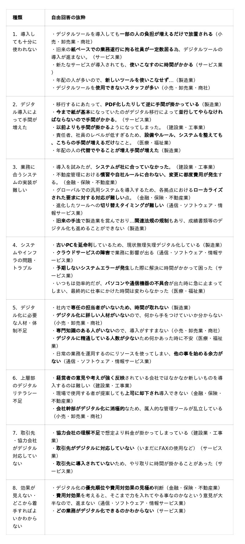 デジタル化で困った経験や問題だと思っていることについての主な自由回答を、次の8種類に分類して抜粋します。