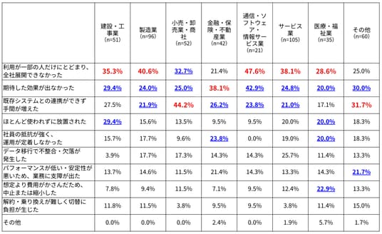 「期待した効果がでなかった」を最も多く挙げた業種は「金融・保険・不動産業」38.1%。「既存システムとの連携ができず手間が増えた」を最も多く挙げた業種は「小売・卸売業・商社」44.2%、「その他」31.7%。どの業種も「利用が一部の人だけにとどまり、全社展開できなかった」「期待した効果が出なかった」「既存システムとの連携ができず手間が増えた」のうち、いずれか2つ以上を上位3つ以内に挙げており、この3つは業界に関わらない共通の失敗ケースと言えます。