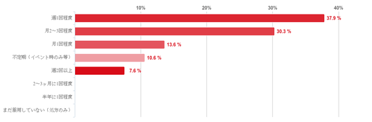 「週1回程度」と回答した人が37.9%で最も多く、次に「月2~3回程度」との回答が30.3%、「月1回程度」が13.6%という順となった。そのほか、「不定期(イベント時のみ等)」(10.6%)や「週2回以上」(7.6%)と回答した人も少数みられた。