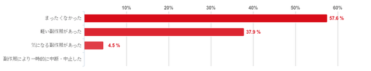 「まったくなかった」と回答した人が57.6%で最も多く、「軽い副作用があった」と回答した人が37.9%で続いた。また、「気になる副作用があった」との回答が4.5%と僅かとなり、「副作用により一時的に中断・中止した」と回答した人はいなかった。