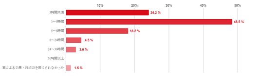 「30分~1時間」と回答した人が39.4%で最も多く、「15~30分」との回答が34.8%と僅差で続いた。また、「1~3時間」(19.7%)や「15分未満」(6.1%)との回答もみられたが、「3時間以上」や「薬の効果を感じられなかった」と回答した人はいなかった。