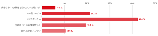 「あまり受けない」と回答した人が42.4%と回答者の約4割となり、次いで、「やや受けやすい」が21.2%、「受けにくい(ほぼ影響なし)」が19.7%と続いた。また、「食事と併用していない」と回答した人も1割程度みられた。