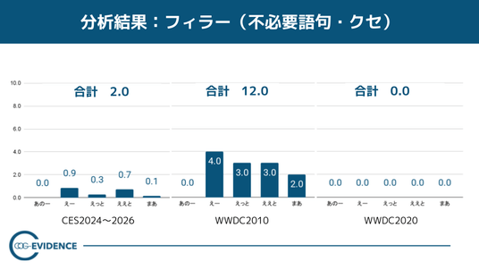 下の図では、高成長企業が行ったCES2024~2026キーノートでの話すフィラーの頻度と、WWDC2010/2020キーノートでのフィラーの頻度を比較しています。