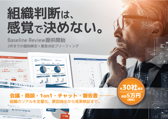 その入口として、短期間で現状の課題と改善の方向性を把握できる「Baseline Review(お試し)」を5万円(税別)で2026年1月27日にリリースいたしました。パフォーマンスが良いトーク/悪いトークの違い(構成・論点の置き方・説得の流れ等)や最終版の再レビュー(Before/After比較)として、録画・音声・書類等を2本ご提出いただき、分析結果とブリーフィング1時間でフィードバックします。