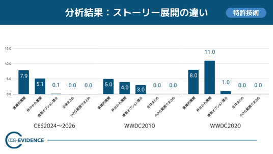 本分析では、CES2024~2026での高成長企業のキーノートと、Apple WWDC2010/2020のキーノートを同一指標で横断比較し、話量増大の中でも「納得と理解を成立させる構造の違い」を独自の特許技術CogStructureで可視化しました。高成長企業群では話量が増える傾向が見られる一方で、WWDCはそのトレンドを先取りしつつ、収録化によって別の解を提示している点が特徴です。多くの情報を伝えるプレゼン設計として、ライブの魅力を“即興対話”に寄せて臨場感を作る方法と、収録・編集で“徹底的にコンテンツ化”し理解を担保する方法という、本分析からは2系統の手法が見て取れました。