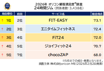 『24時間ジム』総合ランキング(2026年 オリコン顧客満足度(R)調査)