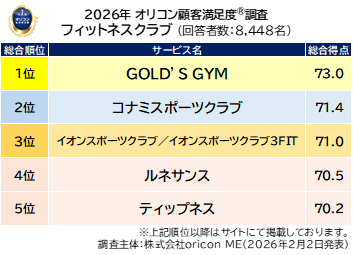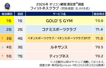 『フィットネスクラブ』総合ランキング(2026年 オリコン顧客満足度(R)調査)
