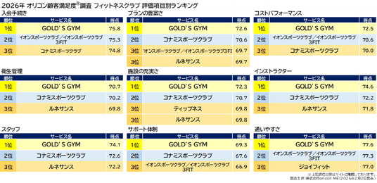 『フィットネスクラブ』評価項目別ランキング(2026年 オリコン顧客満足度(R)調査)