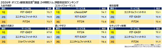 『24時間ジム』評価項目別ランキング(2026年 オリコン顧客満足度(R)調査)