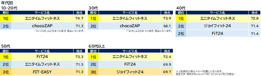 『24時間ジム』部門別ランキング「年代別」(2026年 オリコン顧客満足度(R)調査)