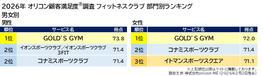 『フィットネスクラブ』部門別ランキング「男女別」(2026年 オリコン顧客満足度(R)調査)