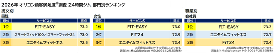 『24時間ジム』部門別ランキング「男女別/職業別」(2026年 オリコン顧客満足度(R)調査)