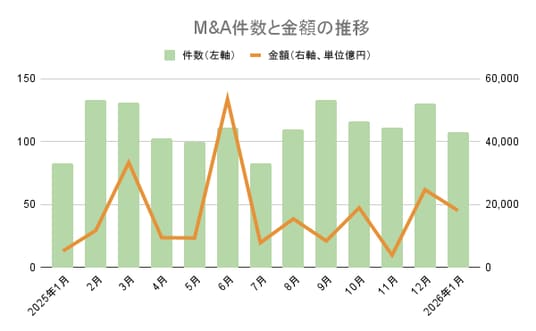 2026年1月のM&A件数(適時開示ベース)は107件と前年同月を24件上回り、28.9%増となりました。取引総額は1兆7623億円(公表分を集計)と前年同月比で約3.3倍に急増。三菱商事による米国のシェールガス事業買収という8000億円超の大型案件が全体の金額を大きく押し上げました。上場企業に義務づけられた適時開示情報のうち経営権の移転を伴うM&A(グループ内再編は除く)について、M&A Onlineが集計しました。
