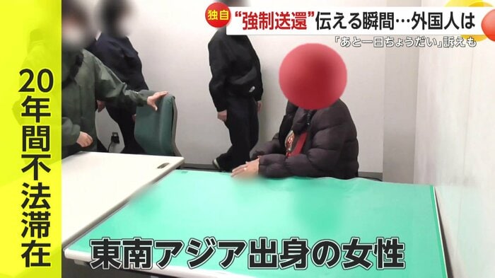 取材班が向かったのは、入管職員が強制送還について初めて伝える部屋。職員とともにこの部屋に入ってきたのは、紫色のダウンを着た東南アジア出身の女性。20年間にわたり、不法滞在していた。