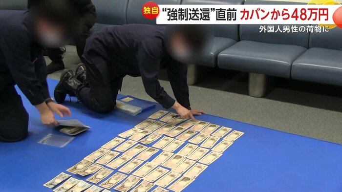強制送還される男性が護送官に促されて、機内持ち込みと預け荷物の仕分けを始めると、小分けにされた封筒から現金が次々に出てきた。総額は48万5053円。