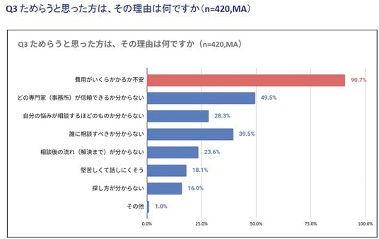 【相談の壁】 いざという時に専門家への相談を「ためらう」人は60.0%。「費用がいくらかかるか不安」が理由の9割超を占める 。