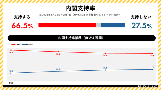 高市内閣の支持率は66.5%(前週比--0.3pt)、不支持率は27.5%(前週比+1.4pt)となりました。