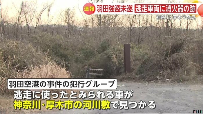 その一刻も早い全容解明が求められる中、新たに羽田空港の事件の犯行グループが、逃走に使ったとみられる車が、神奈川・厚木市の河川敷で見つかったことが分かった。