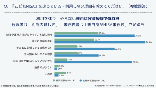 こどもNISAの利用を「迷っている」「利用する予定はない」と回答した保護者に理由を聞いたところ、投資経験者では「制度や運用方法がわからず、判断に迷う」(16.6%)「家計に余裕がない」(15.1%)「子どもに説明できる自信がない」(8.5%)が上位に上がりました。