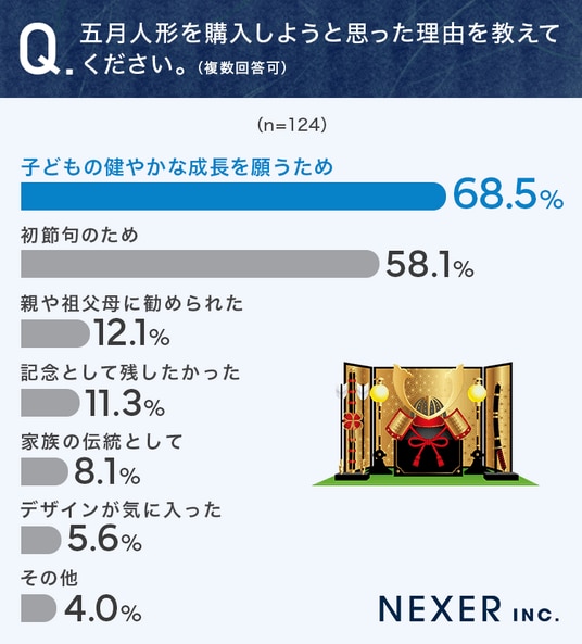 そこで今回は、節句人形を販売する「浅草橋人形工房すずなり」と共同で、事前調査で「五月人形を購入したことがある」と回答した全国の男女124名を対象に「五月人形を選ぶポイント」についてのアンケートを実施しました。