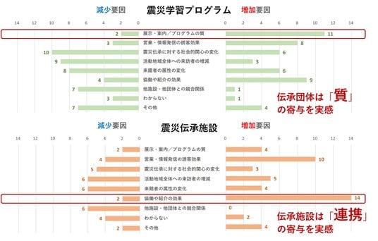 震災学習プログラム実施団体、震災伝承施設の各運営担当者より、増減要因について選択式で回答いただきました。(複数回答可。来訪数増加していても減少要因回答可、来訪数減少していても増加要因回答可で集計)