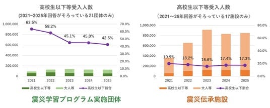 2024年に減少に転じた震災学習プログラムおよび震災伝承施設への来訪者数は、2025年も前年比微減にとどまり、2年連続での全体数減少となりました。