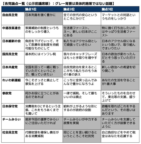 【各党論点一覧(公示前議席順):グレー背景は具体的施策ではない話題】