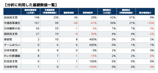 ・議席数増減予想から、勢いのある・ない党の特徴を特定