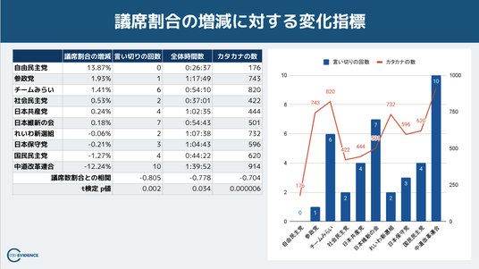 序盤情勢調査から議席割合が増える想定の党ほど、マニフェスト動画は短くなる傾向が確認されました。加えて、発話の特徴として、言い切り表現が減る(断言を避ける)傾向が見られ、同時にカタカナ表現も減る傾向が確認されました。