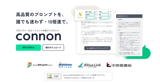 「connon(コノン)」は、Meta Promptingをより簡単に行う専用サービスです。“高品質なプロンプトを誰でも迷わず、10倍速で”作成できるよう支援するアシスタントAIサービスとして、効果的なプロンプトをすばやく作れるよう支援します。社内で共有するプロンプトやAIエージェントの作成効率と品質向上を通じて、業務でのAI活用を後押しします。