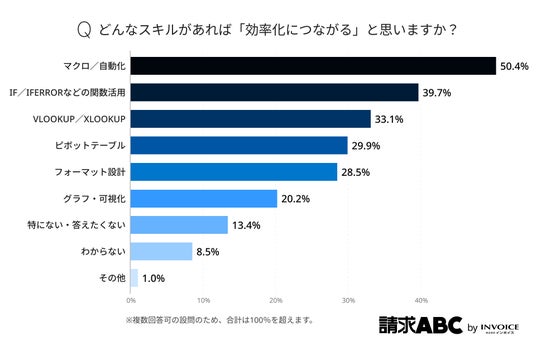 加えて、業務効率化につながるExcelスキルに関する調査では、「マクロ/自動化」(50.4%)でした。繰り返し作業の効率化への期待が大きい一方で、マクロを扱える人が社内に少ないケースも多く、なかなか取り組みづらい領域でもあります。