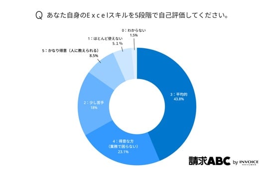 また、自身のExcel習熟度に関する調査では、「3:平均的」と答えた層が43.8%と最も多く、多くの担当者が日常業務で必要な操作は問題なくこなせることが分かります。