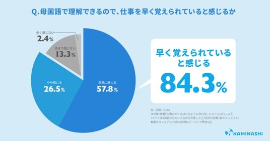 - 約6割が業務をOJTで学ぶも、うち半数が聞き直しを躊躇。また母国語に対応した手段で業務を習得した層の8割は「母国語だからこそ早く習得できた」と回答