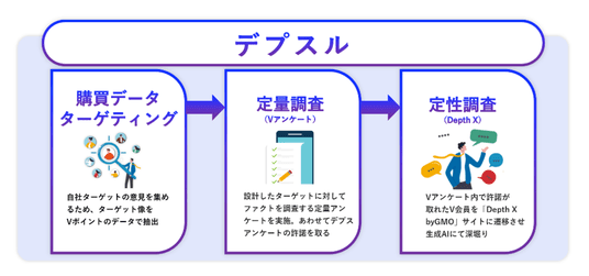 CCCMKホールディングスでは、こうした課題を解消できる手法として、購買データ・定量調査・生成AIを活用した定性調査(DepthX byGMO※)を組み合わせたハイブリッド型リサーチ「デプスル」を提供しています。