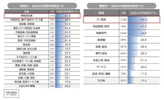 3. 生成AIの業種別利用割合では情報通信業61.3%、IT・開発職64.5%が突出:業務における生成AI利用割合は、業種別では「情報通信業」が61.3%と最も高く、他業種を大きく上回っている。