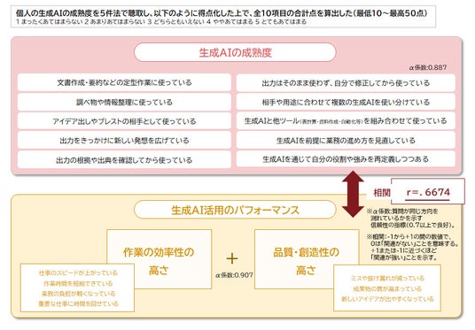 <生成AI成熟度を10項目で測定し、パフォーマンスとの相関も確認>