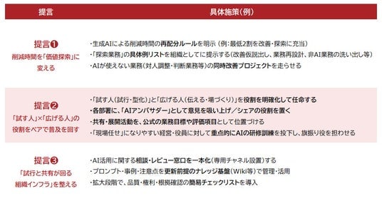 AIによる時間削減効果を「日常業務の消化」で終わらせず、改善・再設計・探索など長期的な付加価値につながる使い道へ流す仕掛けを先に設計することを検討したい。