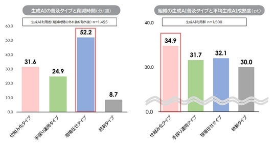 組織の生成AI普及タイプごとの時間削減効果と成熟度は異なる:生成AIによるタスクの平均削減時間は組織の生成AIの普及タイプによって大きく異なり、「現場任せタイプ」が週52.2分と最も高い。一方、生成AI成熟度は「仕組み化タイプ」が最も高く、「統制タイプ」では時間削減・成熟度ともに低水準にとどまる。短期的な効率化は現場の部分最適でも実現しえるが、持続的な高度活用には仕組みの整備が不可欠であることが示唆される。