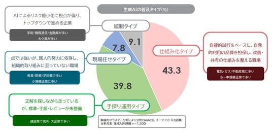 10. 生成AI普及の進め方は4タイプに分かれ、成熟度・時間削減・リスクに差:企業の生成AIの方針・利用ルール・レビュー・監査等の回答傾向から、企業の生成AI普及の進め方は「仕組み化」「手探り運用」「現場任せ」「統制」の4タイプに分かれ、タイプによって時間削減効果や成熟度、リスク事象の出方が異なる。最も多いのは「仕組み化タイプ」(43.3%)、続いて「手探り運用タイプ」、 「統制タイプ」 、「現場任せタイプ」と続く。
