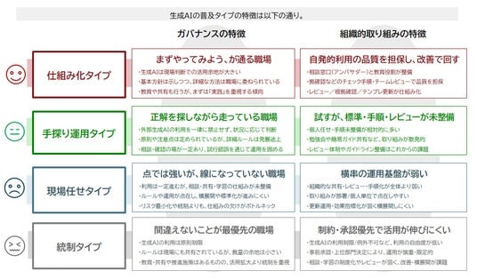 10. 生成AI普及の進め方は4タイプに分かれ、成熟度・時間削減・リスクに差:企業の生成AI普及の進め方は「仕組み化」「手探り運用」「現場任せ」「統制」の4タイプに分かれ、タイプによって時間削減効果や成熟度、リスク事象の出方が異なる。