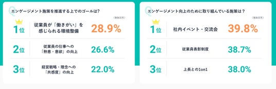 また、実施施策としては「社内イベント・交流会」「従業員表彰制度」「上長との1on1」など、対話を促す取り組みが多く挙げられています。