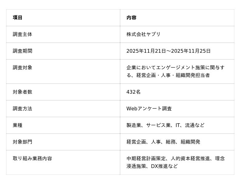 社内エンゲージメントアプリ「UNITE by Yappli」(ユナイト バイ ヤプリ)を提供する株式会社ヤプリ(本社:東京都港区、代表取締役:庵原保文、以下「ヤプリ」)は、人的資本経営の推進を背景に重要性が高まる「従業員エンゲージメント施策」について、企業の経営企画・人事・組織開発担当者432名を対象に実態調査を実施しました。