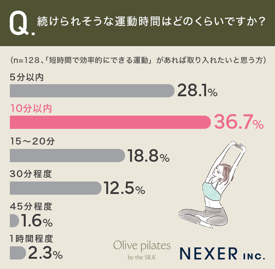 その結果、もっとも多かったのは「10分以内」で36.7%、次いで「5分以内」が28.1%、そして「15~20分」が18.8%となり、約65%の方が10分以内の運動を希望していることがわかりました。