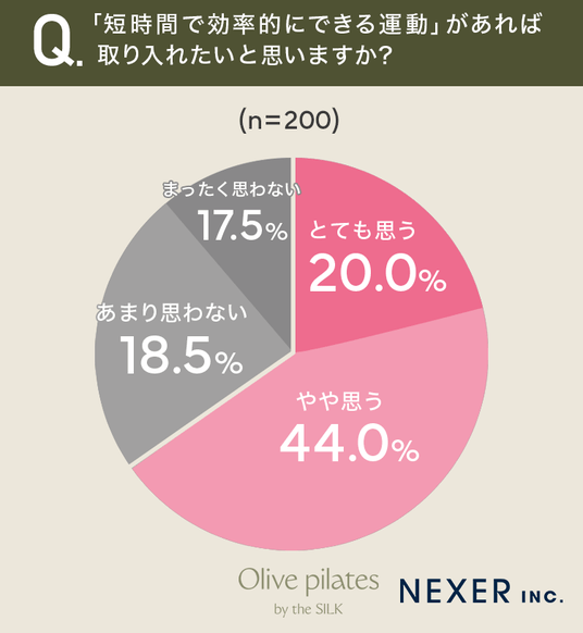 その結果「とても思う」が20.0%、「やや思う」が44.0%で、合わせて64.0%の女性が短時間で効率的にできる運動に関心を持っていることがわかりました。