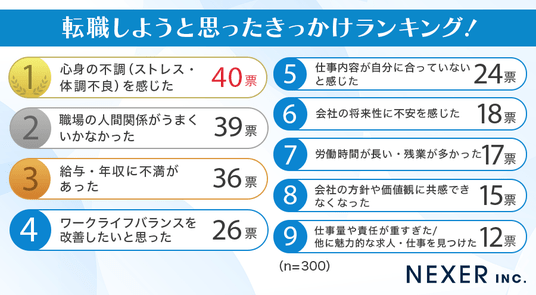 ということで今回は講演会講師派遣サイト『スピーカーズ』と共同で、事前調査で「転職検討もしくは経験がある」と回答した全国の男女300名を対象に、「転職しようと思ったきっかけ」についてのアンケートをおこないました。